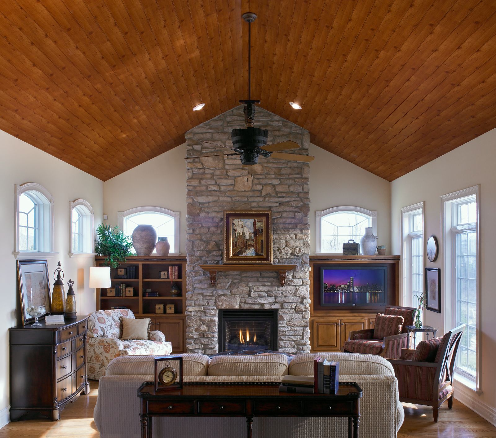 Ceilings 101 offers great inspiration photos - like this wood ceiling. WoodHaven Wood Rustic Pine 5" x 84" Plank ceiling adds a lovely warm texture to this traditional home.