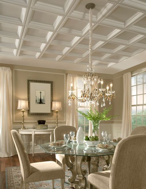 I love this before & after of the tiled ceiling transformation thanks to the Easy Elegance Coffered ceiling tiles.